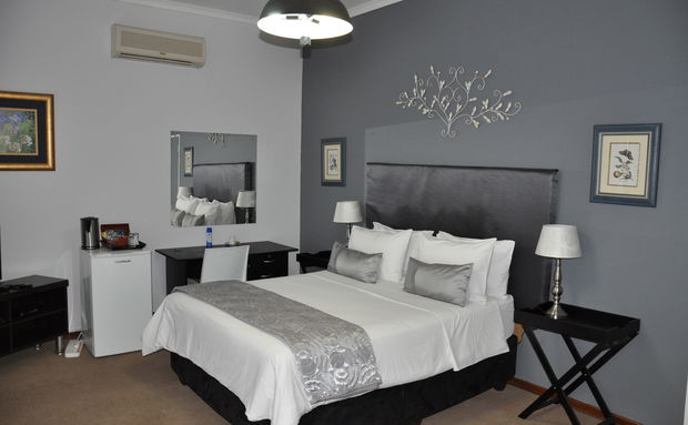 Superior large carpeted queen room with views of the pool from the veranda. A separate large bathroom with bath and shower. DSTV and Air conditioner and fridge, kettle and desk.